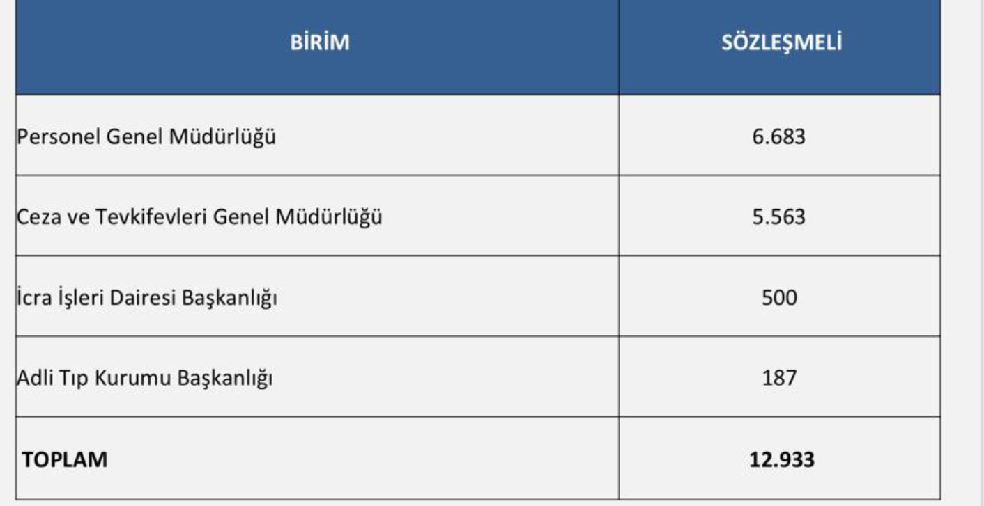 Bozdağ’ın paylaşımına göre, Personel Genel Müdürlüğüne 6 bin 683, Ceza ve Tevkifevleri Genel Müdürlüğüne 5 bin 563, İcra İşleri Dairesi Başkanlığına 500, Adli Tıp Kurumu Başkanlığına 187 sözleşmeli personel alınacak.