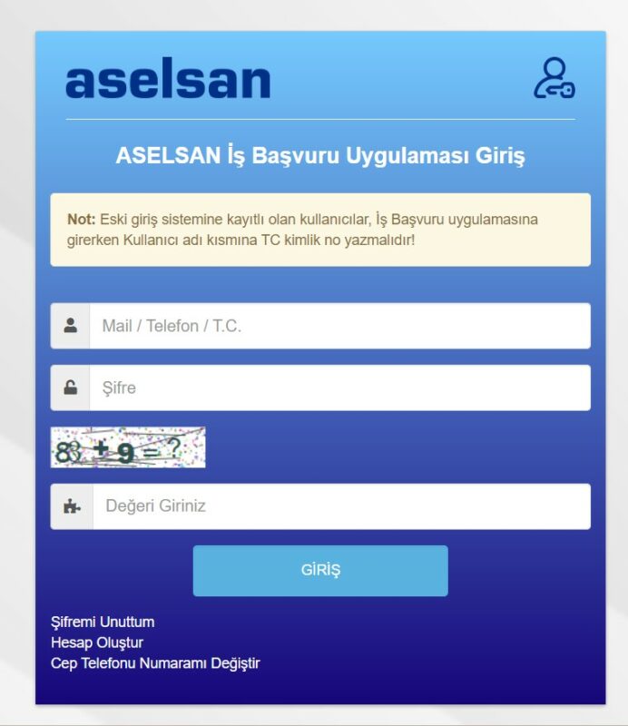 Böylelikle kendiniz için en uygun alana başvuruda bulunabilirsiniz. ASELSAN’a iş başvurunuzu göndermeden önce sisteme T.C. kimlik numaranız ile kayıt olmalısınız.